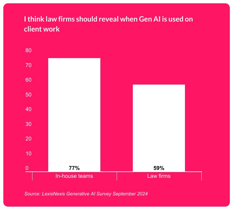 The technology also needs to be used in a compliant manner, without any data being compromised or confidentiality broken. For example, do clients know when it's being used? Do they need to know? The survey revealed the expectations are varied —77% of in-house legal teams believe clients want to be told if AI is used by external counsel, compared to 59% of firms.
