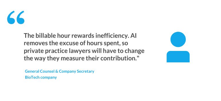The General Counsel & Company Secretary at a BioTech company says: “The billable hour rewards inefficiency. AI removes the excuse of hours spent, so private practice lawyers will have to change the way they measure their contribution.”