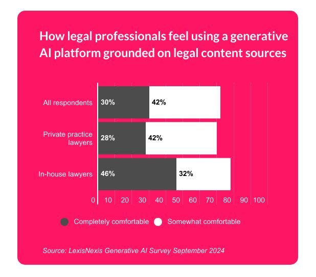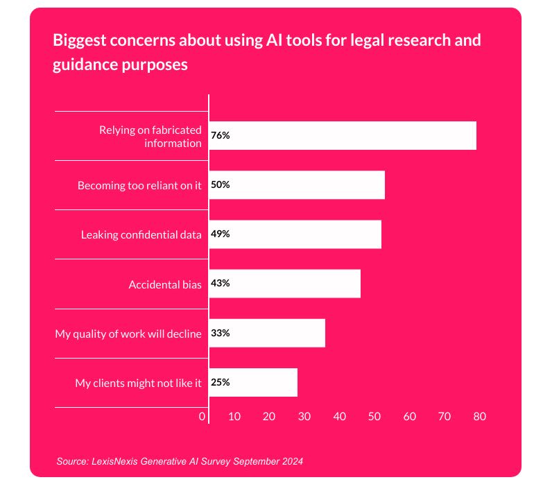 Having trust in the results returned is another big worry, with hallucinations remaining the top concern for lawyers involved in the survey (76%). However, 72% of lawyers said they’d feel more confident using a generative AI tool grounded on legal content sources, with linked citations to the verifiable authority, up from 65% in January 2024.