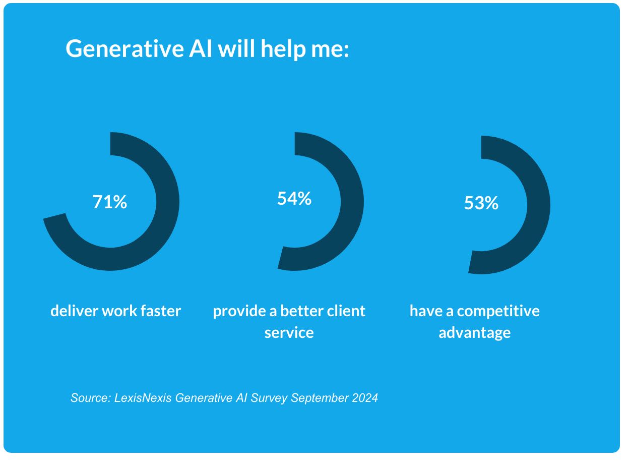 With the increasing adoption of this technology, the number of lawyers who believe AI will help them deliver work faster has dramatically risen to 71% in September 2024. Other top benefits were a better client experience (54%) and a competitive advantage (53%).