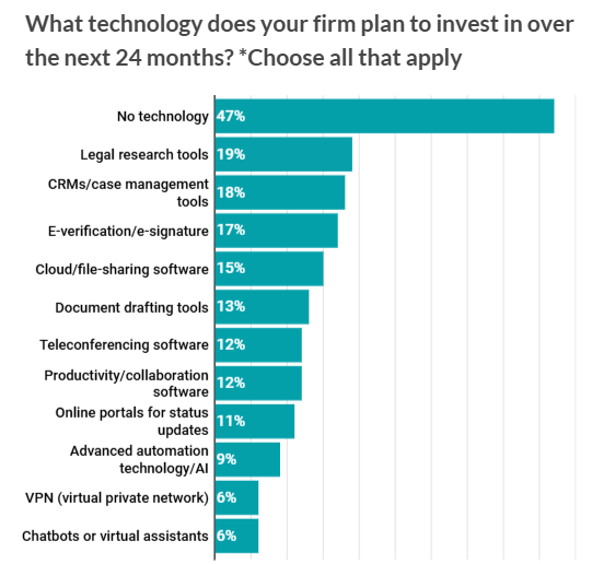 Only 6% said they are using advanced legal technology such as AI robots, while an additional 5% said they are using chatbots.