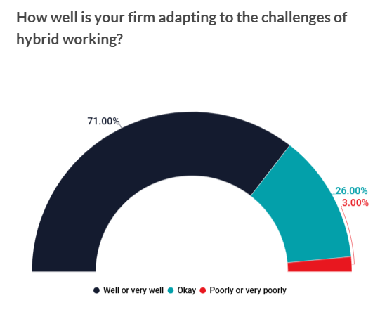 Three quarters (71%) of respondents also revealed that their law firm has adapted well or very well to the challenges of hybrid working – only 3% said they had responded poorly or very poorly.