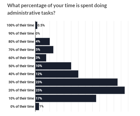 Nearly three-quarters (70%) of respondents said they spend between 20-50% of their time on admin work, while 12% said they spend more than 50% of their time on admin work.