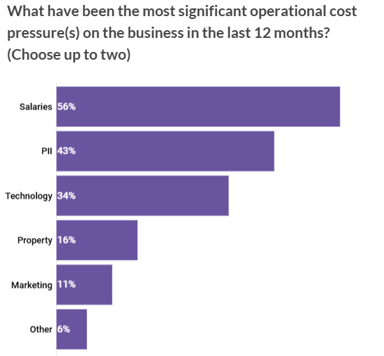 Salaries (56%) and Professional Indemnity Insurance (43%) have been the most significant operational costs for small law firms in the last 12 months, while technology spend is also high at 34%.