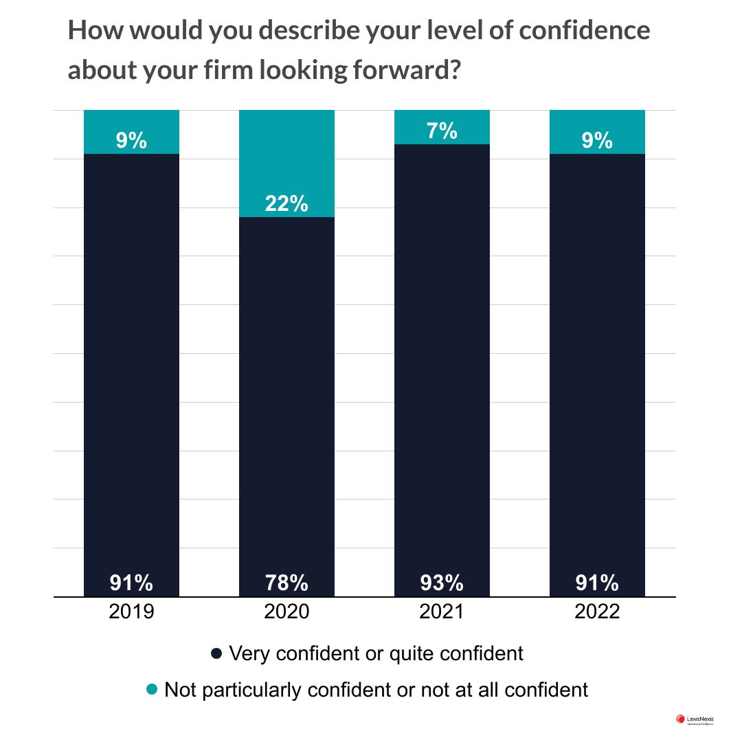 After a serious low and a soaring high, business confidence levels have returned to pre-pandemic levels. Results from our 2022 Bellwether survey revealed 91% of respondents are quite confident or very confident about the future of their firms (a 2% decrease from last year). A lazy conclusion to this change would be that confidence is slipping, but it is more likely the aftermath of the post-lockdown legal boom which saw the UK’s law firms generate a whopping £41.58bn in revenues, compared to annual turnovers of £36.78bn in 2020.