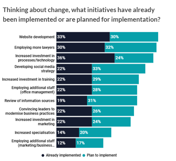Employing more lawyers was also high on the agenda, with almost two-thirds saying they have or plan to invest in more legal experts. However, investing in increased specialisation and employing additional staff to develop marketing or business development was low on the priority list.