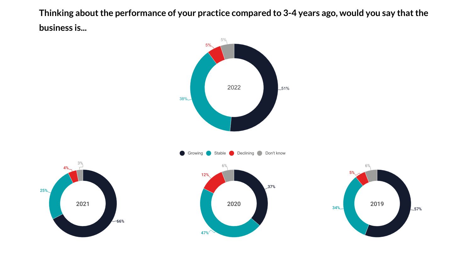 When asked about the performance of their practice compared to three to four years earlier, just over half (51%) of respondents said they are growing. This is a noticeable slip from the two-thirds (66%) of respondents who said the same thing in 2021, hinting that the post-lockdown boom that came to define 2020 and 2021 has come to an end.