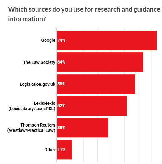 Three quarters (74%) of respondents said they use Google for research and guidance information, 64% said the Law Society, and 58% said Legislation.gov.uk. Over a half (52%) use LexisNexis and over a third (38%) use Thomson Reuters.