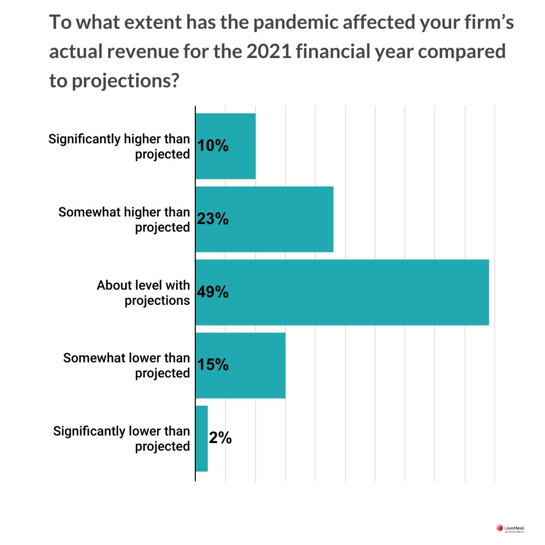 A third of respondents said the impact the pandemic has had on 2021 financial predictions was somewhat higher (23%) or significantly higher (10%) than projected. Just under half (49%) of respondents said their financial predictions were about level with what they expected. Only 17% said it was smaller or significantly smaller.
