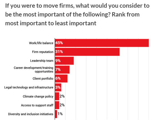Yet, as work-life balance was ranked as the most important factor for finding a new job, the true impact that the growing demands of clients is having on lawyers' personal lives is likely to be significantly higher than many are letting on.