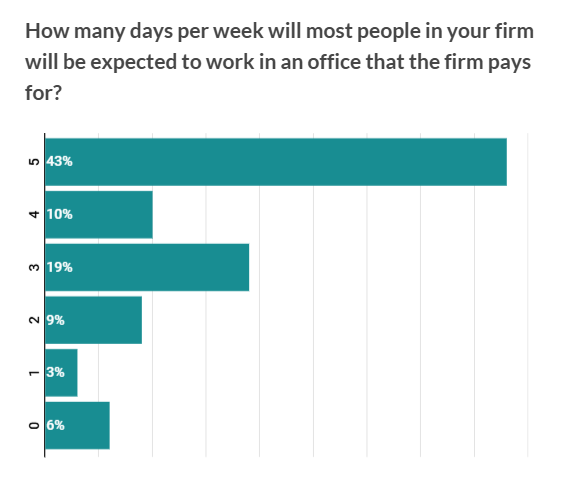 When asked how many days they are expected to work in the office, 43% of the respondents said five days a week while 19% said three days. Only 6% said they weren’t expected to go into the office at all. This appears unchanged from last year’s survey which saw 42% saying five days a week and 19% saying three days a week.