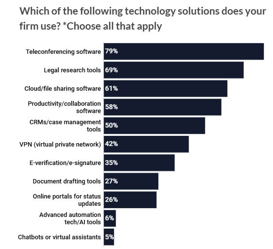 When asked which tech tools are currently in place, perhaps unsurprisingly, teleconferencing had the highest adoption rate at 79%. This was followed by legal research tools at 69%.