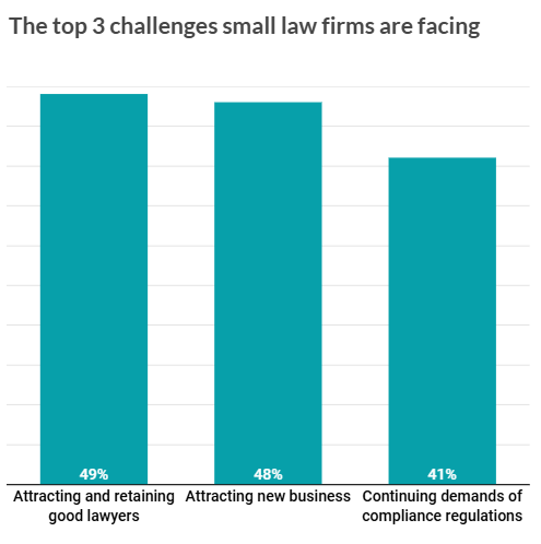Another commonly cited threat was the need to keep up to date with changes to the law (78%), as was the continuing demands of compliance regulations (77%), and the need to attract and retain good lawyers (77%).