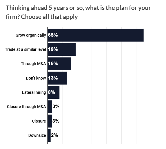 Organic growth is the priority for most small law firms, with 65% of respondents revealing that their businesses are planning to grow through organic means in the next five years or so. This is a small slip from the 66% we saw in 2021.