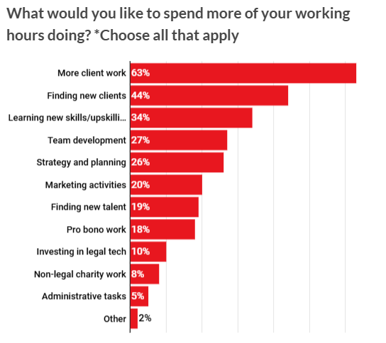 The majority of lawyers would rather spend their time on more business critical tasks. Almost two-thirds (63%) said they would like to spend more of their working hours on client work and just under half (43%) said they would like to spend more time finding new clients.