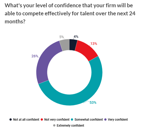 We also asked legal experts how confident they are about competing for talent over the next 24 months. Half (53%) said they are only somewhat confident. Just under a third (31%) said they are very confident or extremely confident. A further 18% expressed doubts about finding the right lawyers.