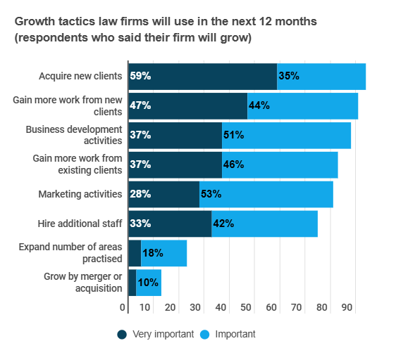 While fewer firms are anticipating growth than in previous surveys, it's reassuring to see the number of firms taking ownership of the tactics used to generate growth. The business owners that invest in a well-polished marketing and business development function will surely have an upper-hand when attracting new clients in today's increasingly-competitive legal landscape.