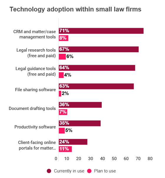 Looking at plans for technology investment in the next 12 months, the most commonly selected answer was client-facing online portals for matter updates, which can save lawyers a significant amount of time going back and forth, and can improve the customer experience. 11% of respondents said they had plans to invest, while less than a quarter (24%) had already invested.