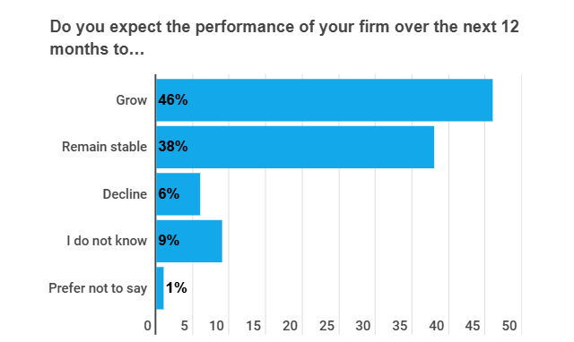 When we asked our respondents how they feel their firms will fare in the next 12 months, almost half (46%) said they're expecting to grow, while just over a third (38%) said they're predicting stability.