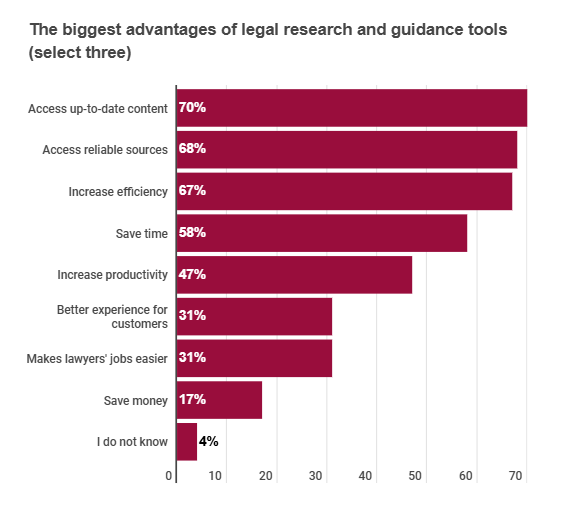 We also asked respondents what aspects of legal research and guidance appeals to them the most. The majority (70%) said accessing up to date content, followed by accessing trusted and reliable sources (68%).