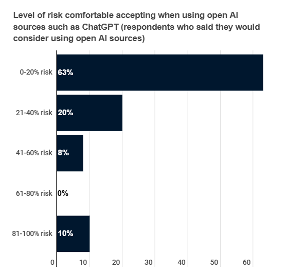 We also asked the 24% of respondents who said they would consider using generative AI for legal sourcing what level of risk they would be comfortable accepting in exchange for convenience and accessibility. The majority (63%) thought under 20% risk to be reasonable for accessing inaccurate or incomplete sources. Only 10% would accept a high risk between 81-100%.