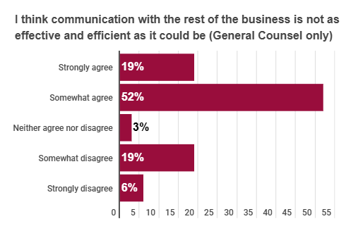 It's therefore not surprising to hear that, when asked about their biggest challenges, 54% of respondents said communication with the wider business could be more effective and efficient. This rose to 71% when looking at general counsel alone.