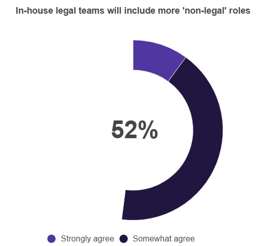 When looking at the makeup of in-house legal departments, more than half of respondents (52%) said they believe teams will look to hire more non-legal roles such as project managers, data analysts or operations roles in the next few years. This is particularly evident among respondents from medium sized teams with 63% stating this to be the case (although even in small teams a significant 45% of respondents said this).