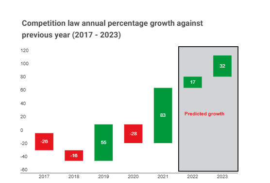 When looking at year-on-year growth, the practice area experienced negative growth in 2020 overall during the height of the pandemic when compared against 2019. In 2021 competition law work went up by a whopping 83% when compared against 2020. The index predicts competition law to grow by 17% throughout 2022 when compared against 2021, and by 32% in 2023 when compared against 2022.