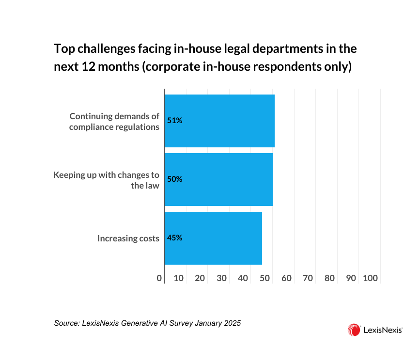 In-house legal departments are up against three very real challenges in the next 12 months: compliance regulations (51%), changes to the law (50%), and rising costs (45%).
