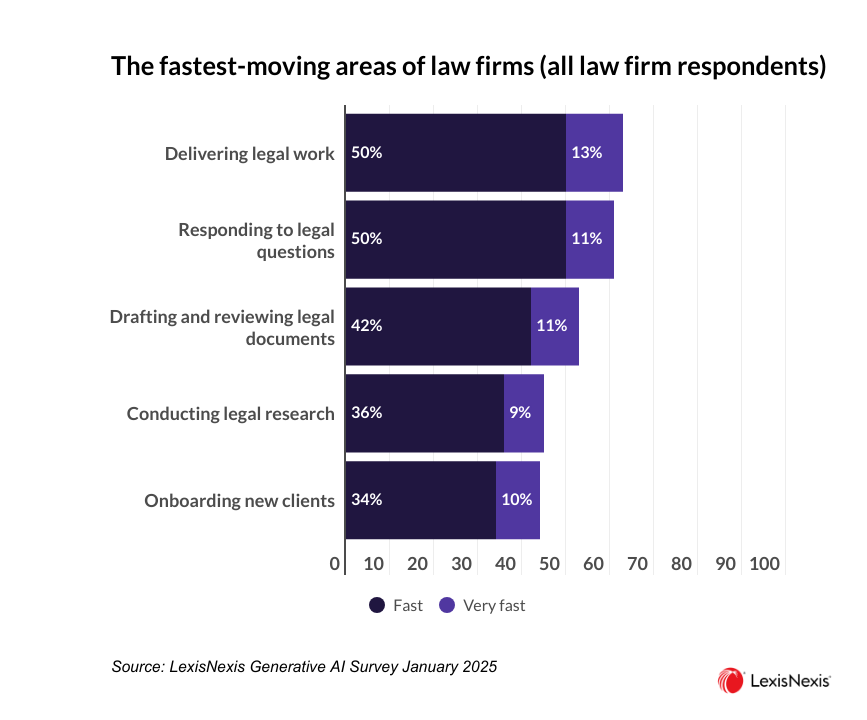 A January 2025 LexisNexis survey found only 18% of private practice lawyers said their firm is fast or very fast at implementing new technology, especially AI. Instead, nearing three-quarters (70%) believe their firm is adequate, slow or very slow.