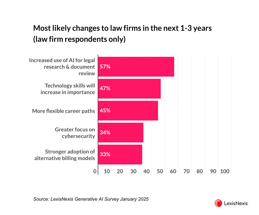 - Firms will become more reliant on AI for legal research and document review (57%)