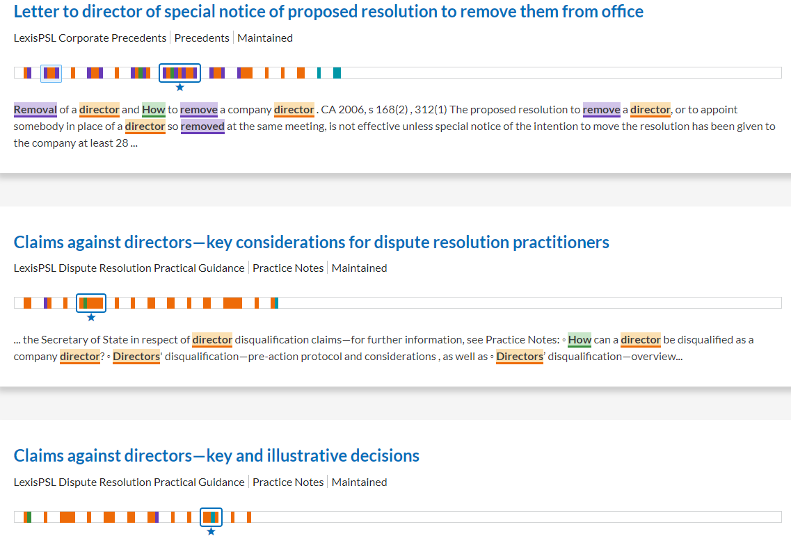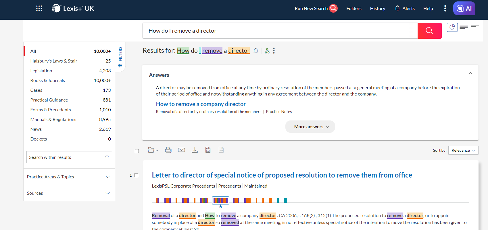 If you search for "How do I remove a director?", Lexis+ UK will present an "Answer Card" containing a direct response to your question.