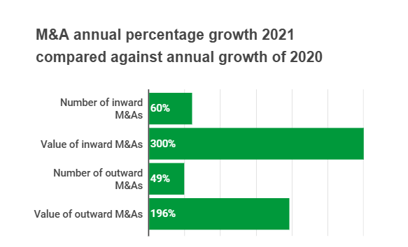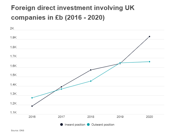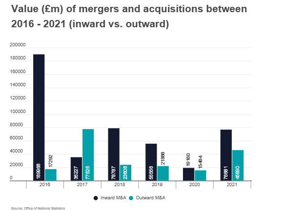 ONS data for 2021 also reveals that the number of outward M&As reached its highest point in the last six years, at 311. After continued growth between 2016 and 2018, outward M&A transactions decreased in 2019 and 2020. ONS estimates the value of these deals reached £45.9 bn in 2021, nearly three times the growth we saw in 2020.