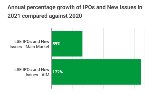 The number of IPOs and New Issues in 2021 sat at 86 for Main Market and 87 for AIM, compared to 2020's 54 for Main Market and 32 for AIM.