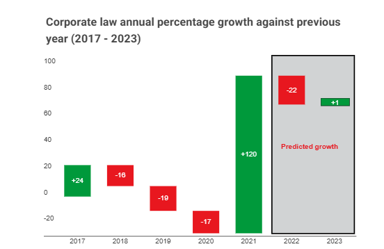 Corporate law is predicted to generate 16% more work in 2022 than in 2021