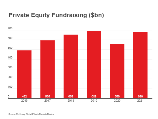 Private equity (PE) fundraising grew by 22% throughout 2021, according to data from McKinsey's Global Private Markets Review.