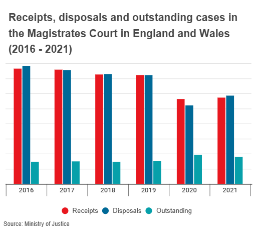 Total case receipts and disposals for the magistrates' courts in England and Wales sat close to 1.5 million between 2016 and 2019. This plummeted down to just over 1 million during the pandemic, and made a small rise in 2021.