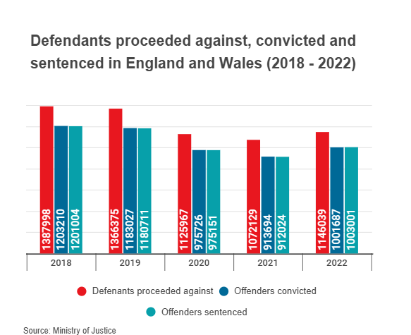 The data for offenders convicted and offenders sentenced tells a very similar story. In 2022, just over a million offenders were convicted across England and Wales, and a similar amount were sentenced.