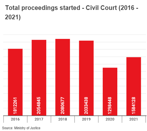The number of Civil Court proceedings started in 2020 were noticeably lower than in recent years, with just under 1.3 million cases coming into fruition. A stark contrast compared to 2019's 2 million+.