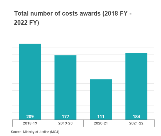In 2021-2022, 184 costs awards were made. Of these, 134 were made in favour of the respondent and 50 in favour of the claimant.