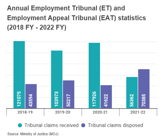 In 2021-22, 1,726 appeals were received by the Employment Appeal Tribunal (EAT), up from 1,196 appeals in 2020–21. However, only 209 appeals were disposed of during 2021–22, much lower than the 752 appeals disposed of the previous year.