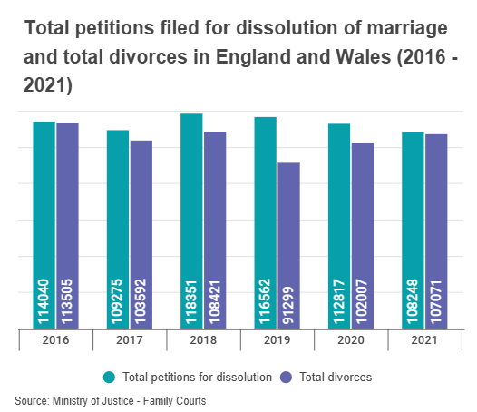 There's been a slight increase in divorce rates since no-fault divorce (Divorce, Dissolution and Separation Act 2020 (DDSA)) came into effect in April 2022.