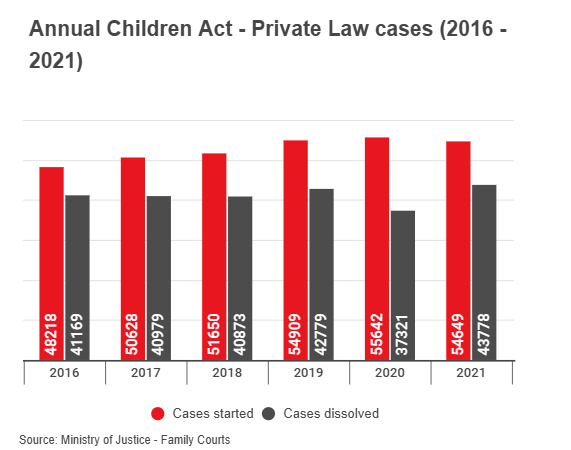 The number of private children cases started in 2021 was on par with recent years, with 54,649 cases in total. This was only a slight decrease from 2020's 55,642 cases being started - which was the record high since recordings began in 2011. When looking at the number of cases started for Q1, Q2 and Q3 of 2022, there are 39,907 cases so far - just under three quarters of 2021's figures.