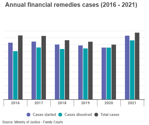 In 2021, the number of financial remedy cases started was 46,461, the highest figures since 2008. For 2022, figures released for Q1, Q2 and Q3 puts the total at 28,103 (roughly 60% of the figure for 2021).