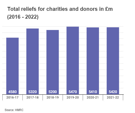 For the 2022 tax year, tax reliefs for charities and donors sat at £5.4 billion - a 1% increase from the previous year. This is relatively on par with recent years.