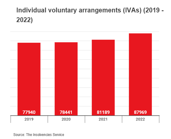 In 2022, the number of individuals declaring individual voluntary arrangements (IVAs) has risen steadily in recent years - jumping by more than 10,000 individuals per year when comparing 2022 to 2019.