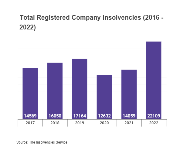 The total number of companies that registered insolvency in 2022 was 22,109, the highest number since 2009 and 57% higher than 2021's 14,059.