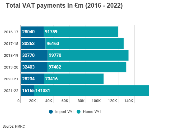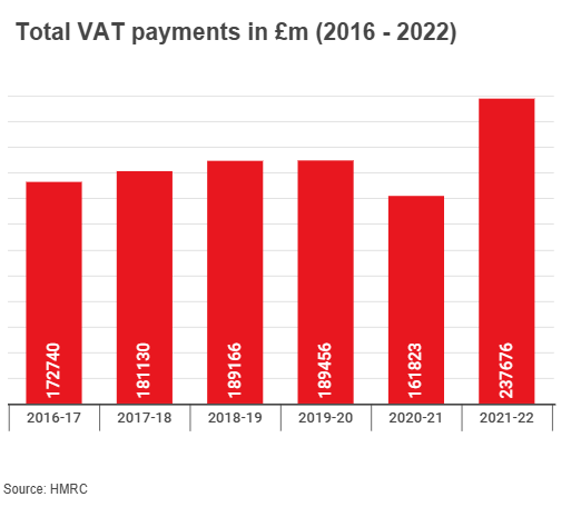 VAT receipts dropped noticeably during the pandemic, from £189.4 million to £161.8 million between 2019-20 through to 2020-21. However, this increased by 55% in 2021-22 when compared with 2020-21.