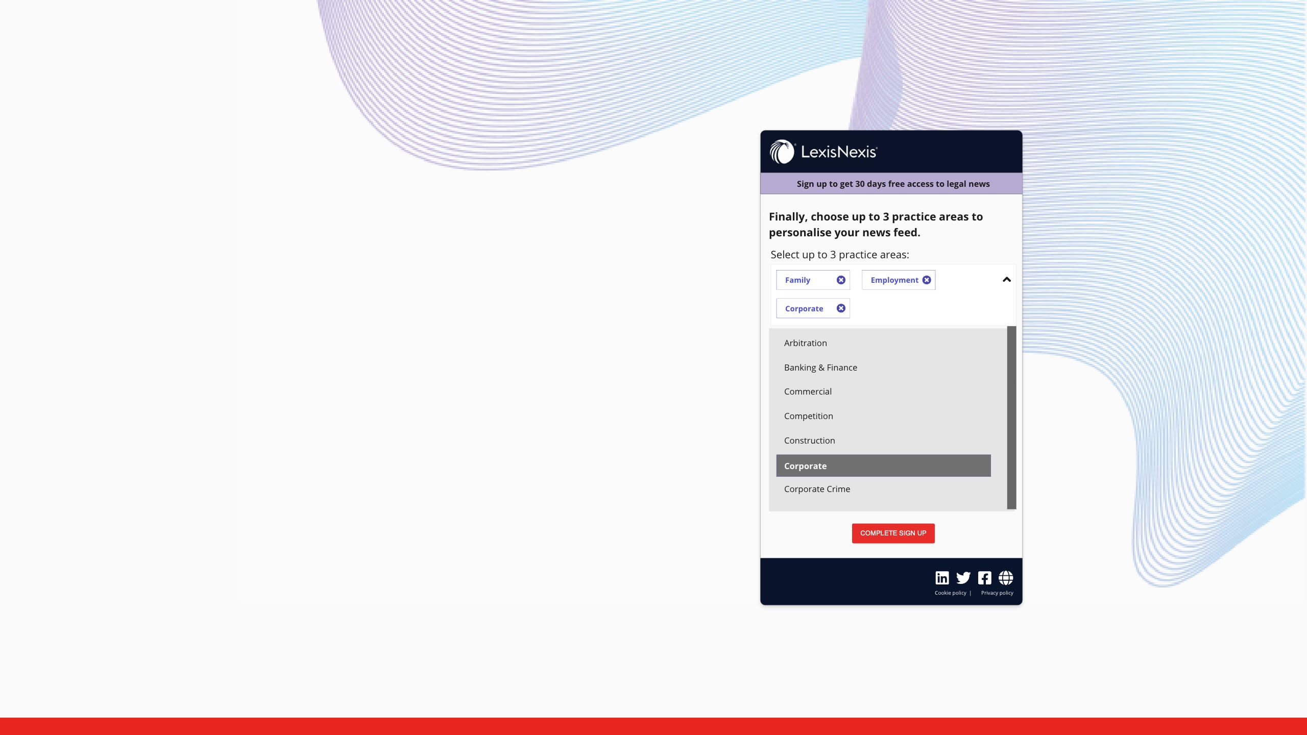 Customise your news feed for up to three legal areas.