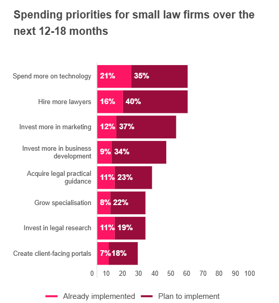 Regardless of the growth strategy chosen, technology investment has emerged as a strategic priority for small law firms. More than a third (35%) of firms plan to increase their spending on technology in the next 12 to 18 months, while one-fifth (21%) have already done so. This emphasis on technology adoption is driven by the belief that it can increase revenues and support business growth, whether through organic expansion or post-merger integration.